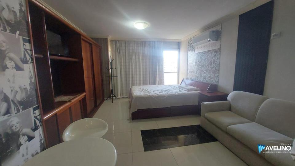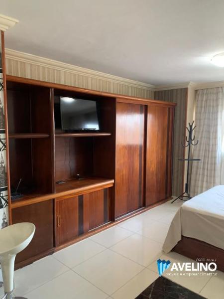 Flat mobiliado com cama, tv, frigobar, microondas, fogão, ar condicionado, 1 banheiro, 1 vaga de garagem. O Hotel possui recepção 24 horas, restaurante e piscina.