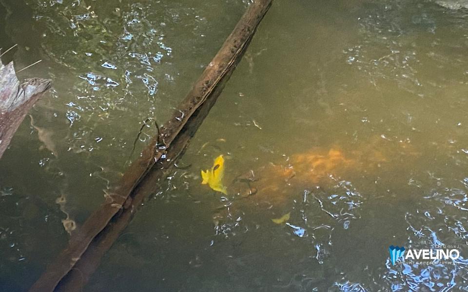 muitas arvores frutíferas, dois tanques de peixe e córrego.